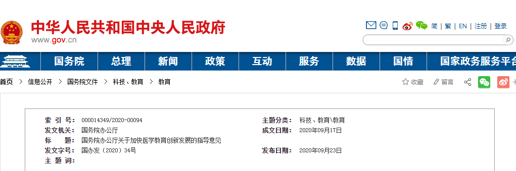 《意見》提出基本原則:以新理念謀劃醫學發展。將醫學發展理念從疾病診療提升拓展為預防、診療和康養,加快以疾病治療為中心向以健康促進為中心轉變,服務生命全周期、健康全過程。各省、自治區、直轄市人民政府,國務院各部委、各直屬機構:醫學教育是衛生健康事業發展的重要基石。黨的十八大以來,我國醫學教育蓬勃發展,為衛生健康事業輸送了大批高素質醫學人才。在新冠肺炎疫情防控中,我國醫學教育培養的醫務工作者發揮了重要作用。但同時,面對疫情提出的新挑戰、實施健康中國戰略的新任務、世界醫學發展的新要求,我國醫學教育還存在人才培養結構亟需優化、培養質量亟待提高、醫藥創新能力有待提升等問題。為加快醫學教育創新發展,經國務院同意,現提出以下意見。(一)指導思想。以習近平新時代中國特色社會主義思想為指導,全面貫徹黨的十九大和十九屆二中、三中、四中全會精神,按照黨中央、國務院決策部署,落實立德樹人根本任務,把醫學教育擺在關系教育和衛生健康事業優先發展的重要地位,立足基本國情,以服務需求為導向,以新醫科建設為抓手,著力創新體制機制,分類培養研究型、復合型和應用型人才,全面提高人才培養質量,為推進健康中國建設、保障人民健康提供強有力的人才保障。——以新理念謀劃醫學發展。將醫學發展理念從疾病診療提升拓展為預防、診療和康養,加快以疾病治療為中心向以健康促進為中心轉變,服務生命全周期、健康全過程。——以新定位推進醫學教育發展。以“大國計、大民生、大學科、大專業”的新定位推進醫學教育改革創新發展,服務健康中國建設和教育強國建設。——以新內涵強化醫學生培養。加強救死扶傷的道術、心中有愛的仁術、知識扎實的學術、本領過硬的技術、方法科學的藝術的教育,培養醫德高尚、醫術精湛的人民健康守護者。——以新醫科統領醫學教育創新。優化學科專業結構,體現“大健康”理念和新科技革命內涵,對現有專業建設提出理念內容、方法技術、標準評價的新要求,建設一批新的醫學相關專業,強力推進醫科與多學科深度交叉融合。(三)工作目標。到2025年,醫學教育學科專業結構更加優化,管理體制機制更加科學高效;醫科與多學科深度交叉融合、高水平的醫學人才培養體系基本建立,培養質量進一步提升;醫學人才使用激勵機制更加健全。到2030年,建成具有中國特色、更高水平的醫學人才培養體系,醫學科研創新能力顯著提高,服務衛生健康事業的能力顯著增強。(四)提升醫學專業學歷教育層次。嚴格控制高職(專科)臨床醫學類專業招生規模,大力發展高職護理專業教育,加大護理專業人才供給。穩步發展本科臨床醫學類、中醫學類專業教育,縮減臨床醫學、中醫學專業招生規模過大的醫學院校招生計劃。適度擴大研究生招生規模,調整研究生招生結構,新增招生計劃重點向緊缺人才傾斜。堅持以需定招,合理確定招生結構和規模。高校要結合人才需求和教育資源狀況,科學合理設置醫學院。(五)著力加強醫學學科建設。在一流大學和一流學科建設中,加大醫學及相關學科建設布局和支持力度。2020年臨床醫學博士專業學位授權單位均須設置麻醉、感染、重癥、兒科學科,大幅度擴大麻醉、感染、重癥、兒科研究生招生規模。優化學科結構,2021年完成醫學二級學科目錄編制調整,將麻醉、感染、重癥學科納入臨床醫學指導性二級學科目錄并加大建設力度。統籌研究醫學相關一級學科設置。修訂臨床醫學博士、碩士研究生培養方案,加強麻醉、感染、重癥學科研究生課程建設,強化實踐能力和科研思維能力培養。在醫學領域新建一批教育部重點實驗室。(六)加大全科醫學人才培養力度。提升基層醫療衛生行業職業吸引力。逐步擴大訂單定向免費醫學生培養規模,中央財政繼續支持為中西部鄉鎮衛生院培養本科定向醫學生,各地要結合實際為村衛生室和邊遠貧困地區鄉鎮衛生院培養一批高職定向醫學生,加快培養“小病善治、大病善識、重病善轉、慢病善管”的防治結合全科醫學人才。系統規劃全科醫學教學體系,3年內推動醫學院校普遍成立全科醫學教學組織機構,加強面向全體醫學生的全科醫學教育,建設100個左右國家全科醫學實踐教學示范基地,加強師資培訓。2021年起開展臨床醫學(全科醫學)博士專業學位研究生招生培養工作,擴大臨床醫學(全科醫學)碩士專業學位研究生招生規模。加快推進全科醫生薪酬制度改革,拓展全科醫生職業發展前景。(七)加快高水平公共衛生人才培養體系建設。提高公共衛生教育在高等教育體系中的定位,依托高水平大學布局建設一批高水平公共衛生學院。加強培養體系建設,強化預防醫學本科專業學生實踐能力培養,加強醫學院校與疾病預防控制中心、傳染病醫院的醫教研合作,3年內建設30個左右公共衛生實訓示范基地。將公共衛生碩士專業學位培養計劃作為公共衛生研究生教育的主體培養計劃,創立發展公共衛生博士專業學位教育,開展多學科背景下的公共衛生高層次人才培養改革試點。加大高層次專業人才供給,將公共衛生與預防醫學相關學科專業納入“國家關鍵領域急需高層次人才培養專項招生計劃”支持范圍,增加專項研究生招生計劃數量,在“十四五”期間持續擴大培養規模。(八)加快高層次復合