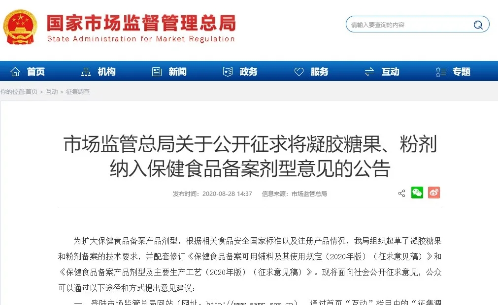 more>>為擴大保健食品備案產品劑型,根據相關食品安全國家標準以及注冊產品情況,市場監管局組織起草了凝膠糖果和粉劑備案的技術要求,并配套修訂《保健食品備案可用輔料及其使用規定(20